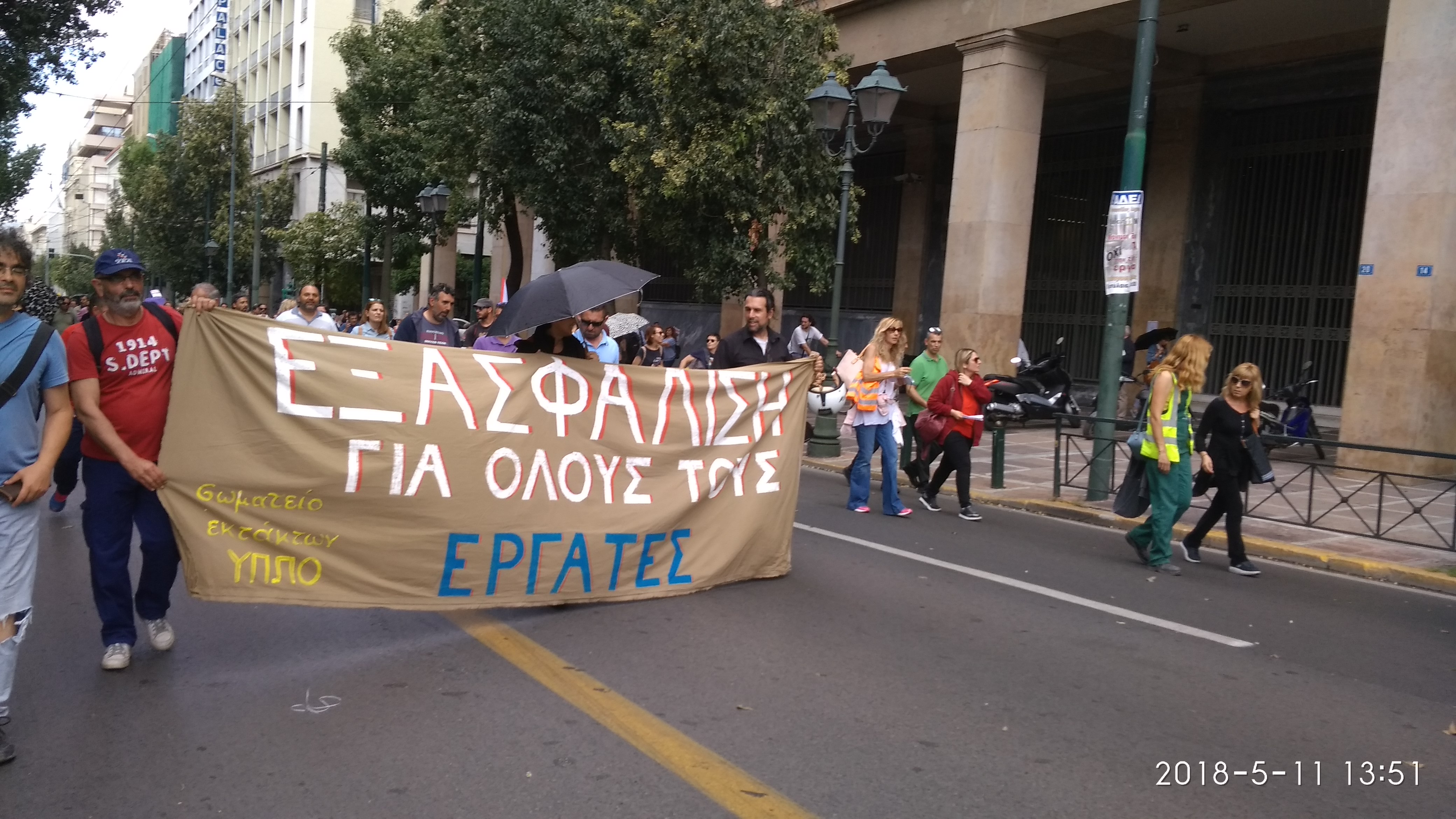 Μετά το πέρας των εργασιών της Συνέλευσης μπλοκ του Σωματείου συμμετείχε στην 24ωρη απεργία του Σωματείου και τη συγκέντρωση των συνδικάτων στα Προπύλαια. Πορευτήκαμε με δυναμικό παλμό και συνθήματα μαζί με εκατοντάδες συναδέλφους μας, συμβασιούχους και μόνιμους, προς το Υπουργείο Διοικητικής Ανασυγκρότησης.